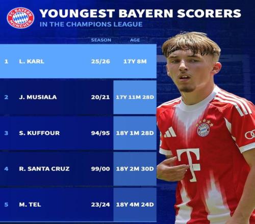 北京时间10月23日,17岁的小将伦纳特-卡尔的进球帮助拜仁慕尼黑在欧冠联赛阶段第3轮的比赛中主场4-0大胜布鲁日,这位德国新星也就此成为了拜仁队史欧冠最年轻的进球球员。与此同时,德转也统计出了拜仁队史最年轻的5位欧冠进球者。