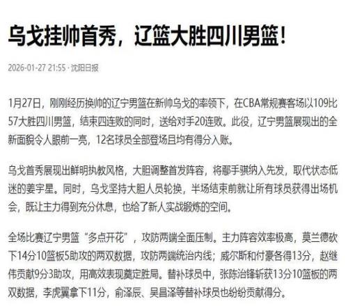 让人意外的是,杨鸣离队仅一天,乌戈就带领辽宁队取得大胜。