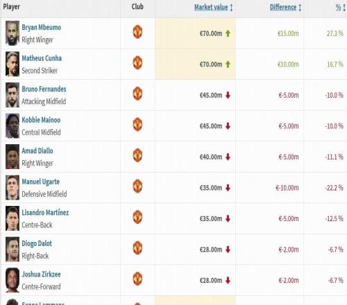 曼联球员身价变动:姆伯莫上涨1500万欧,乌加特下跌1000万欧